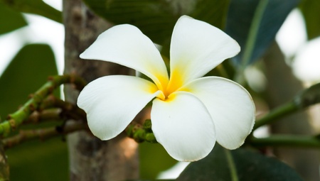 Serene White Plumeria Blossom in Natural Outdoor Setting