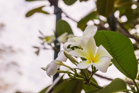 White plumeria frangipani flowers with leaves. (sensitive focus)