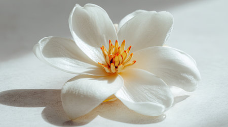 A stunning white flower showcases its delicate petals and vibrant yellow center, beautifully illuminated by soft sunlight, creating a serene ambiance.