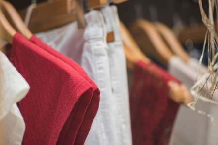 Shopping in store. Clothes on hangers in shop for sale. Blur background. Fashionable clothes in a boutique. Various clothing on market.