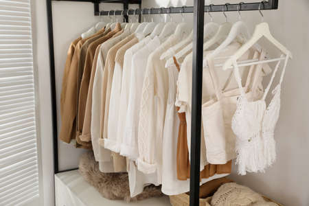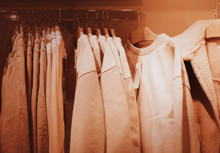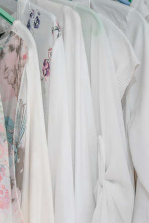 Close up of white feminine clothes on the hangers, fresh casual collection
