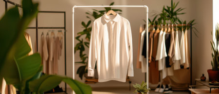 A stylish white shirt hanging in a contemporary clothing store, surrounded by green plants and bathed in natural light.