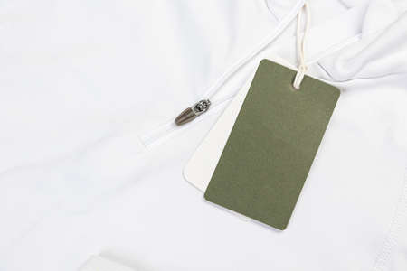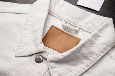 Blank clothing label on denim jacket texture. Label with empty space for text.