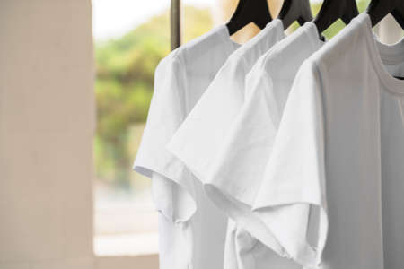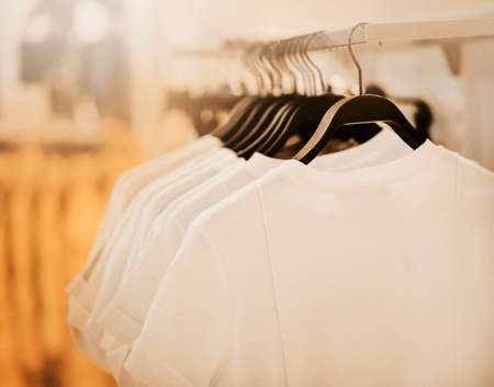 Basic casual white T-shirts hang on black hangers in a clothing store, illuminated by light. Shopping and sale. Comfortable clothes.