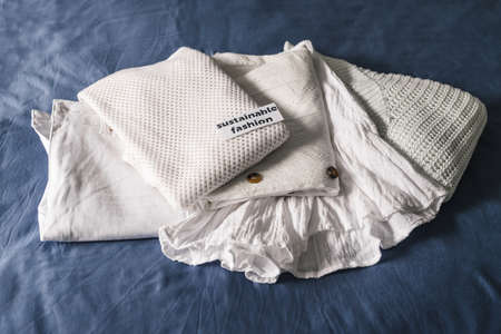 ethical brands and fair trade concept, pile of clothing with Sustainable Fashion label