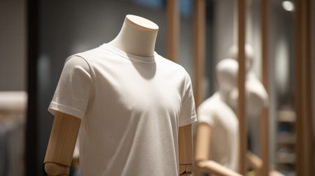 Contemporary fashion flat display, white t-shirt on male mannequin with wooden arms, clean visual symmetry, neutral light