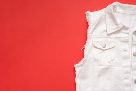 Summer fashion flat lay with white jacket, denim shorts and sneakers on white background, top view,