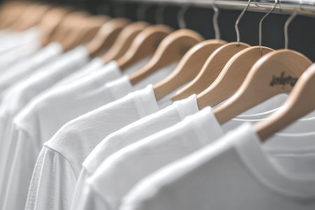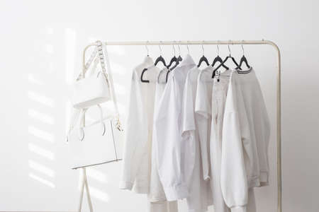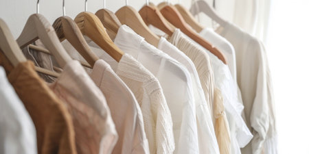 Chic white garments neatly arranged on wooden hangers in a bright, airy interior suggest a minimalist style.