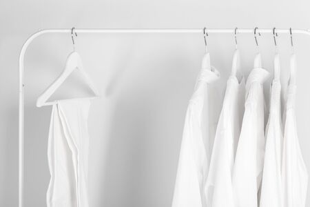 white medical doctor or physician lab coats with pink pants hanging on clothes mobile gray hangers with wheels, on white background. copy space, selected focus. vertical picture.
