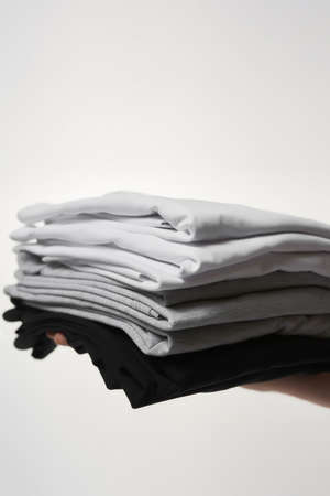 This image features a stylish arrangement of black and white t-shirts hanging neatly in a modern wardrobe. Perfect for showcasing minimalist fashion design.
