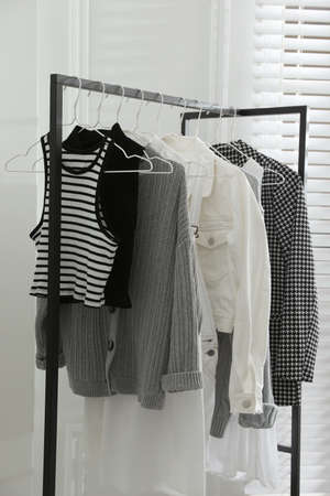 Modern interior of an open dressing room with a hanger for stylish women's clothing
