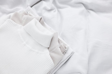 Fashion concept with female clothes and accessories on white linen. Flat lay, top view lifestyle fashion minimalist blogger composition.