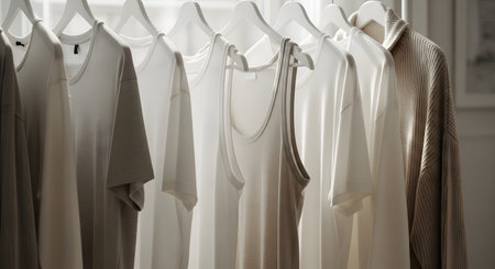 A collection of neutral-toned clothing items, including t-shirts and a sweater, hanging neatly on white hangers. The image highlights a minimalist wardrobe organization or retail display with soft lighting emphasizing the textures of the fabrics.