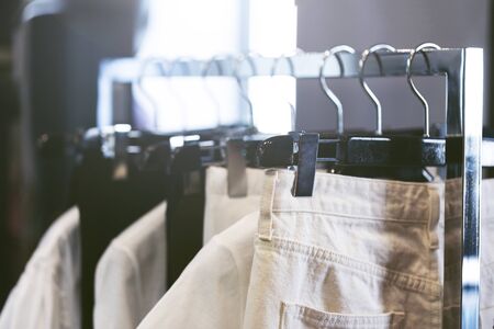 White trousers, jeans, white longsleeves and a jacket hang on wooden hangers in a clothing store. shopping and sale. Choosing clothes to buy.