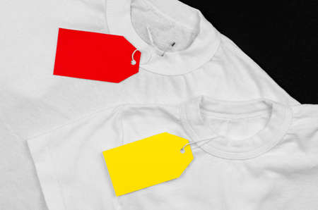 Two white t-shirts on a black background with empty price tags. Blank label on clothes