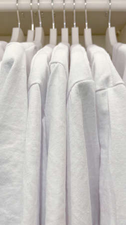 Crisp white T-shirt hanging in a row among other plain shirts on a clothing rack