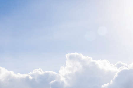 Bright sunlight illuminates fluffy white clouds against a pale blue sky, creating a soft, diffused light with a subtle lens flare.