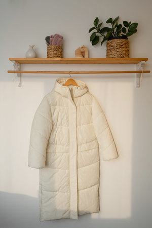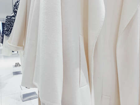 White Winter coats in the store. Clothes store outlet concept. Store showcase. High quality illustration