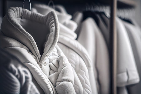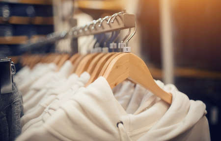 Shopping in store. Clothes on hangers in shop for sale. Blur background. Fashionable clothes in a boutique. Various clothing on market.