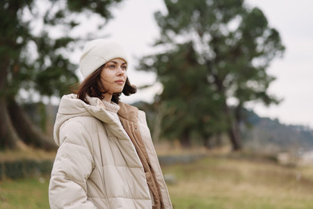 Woman in a beige puffer jacket and knit hat stands in a park setting, calm and thoughtful, capturing a peaceful outdoor moment with soft natural light and a blurred green background.