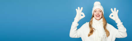 happy blonde beautiful woman in winter white outfit showing ok on blue background, banner