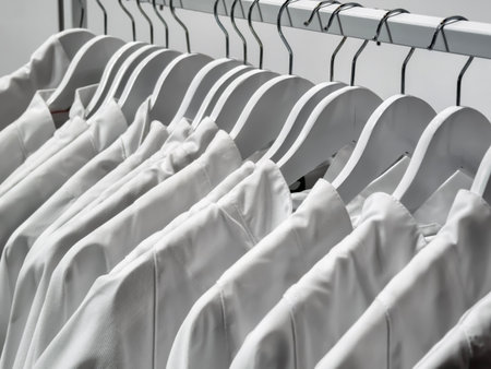 White medical doctor or physician lab coats with stethoscope hanging on clothes hangers, copy space, selected focus