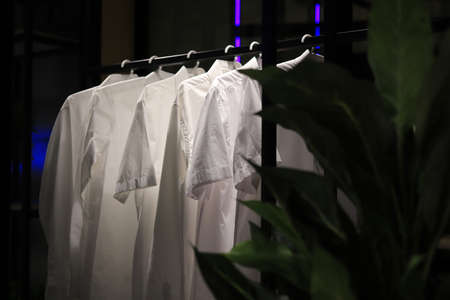 Basic casual white T-shirts hang on black hangers in a clothing store, illuminated by light. Shopping and sale. Comfortable clothes.