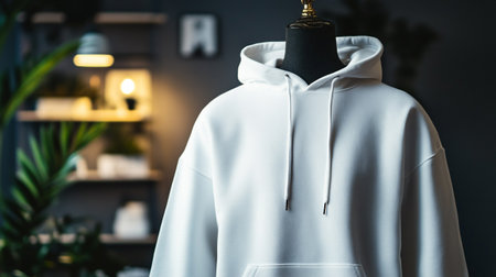 Beige sweatshirts with a warm soft collar hang on hangers in a clothing store. Fashionable trendy outerwear for the autumn season. Shopping and sale.