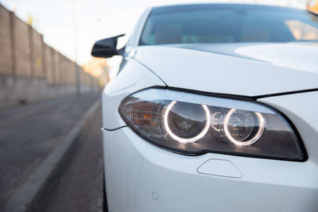 Led headlight of a white modern car. Modern trends in the automotive industry. Head optics of the machine