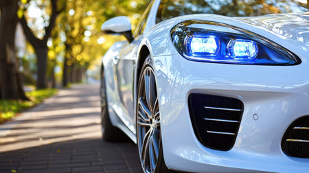 A striking white sports car featuring blue headlights parked gracefully on a picturesque autumn street, surrounded by vibrant foliage and sunlight.