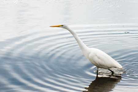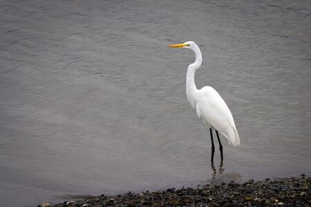 White heron, Great Egret, walking along the shore. Peaceful wildlife scene