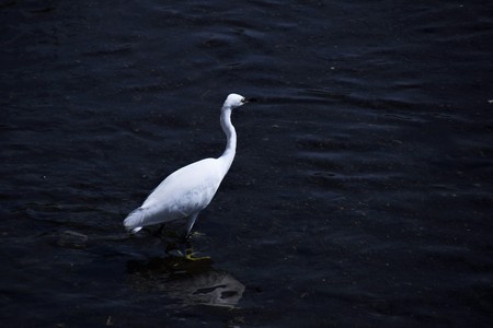 The small white heron or Little egret stands in the lake. Small White Heron, lat. Egretta garzetta, looking at fish in shallow water
