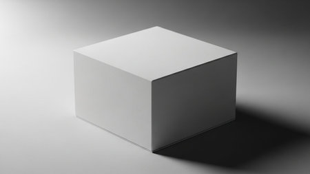 A plain white cube sits on a light gray surface, casting a distinct shadow under dramatic studio lighting.