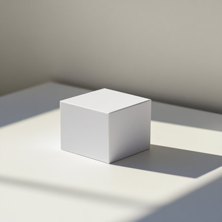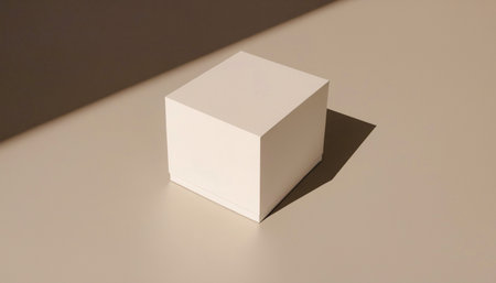 Simple image of a blank white cube box sitting on a beige surface with a shadow cast by sunlight. Premium mockup with a clean and elegant white background.