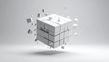 A complex system, represented by a pristine white cube, explodes into its fundamental components.