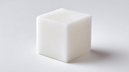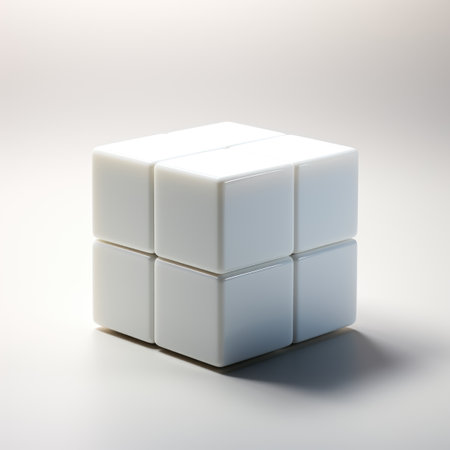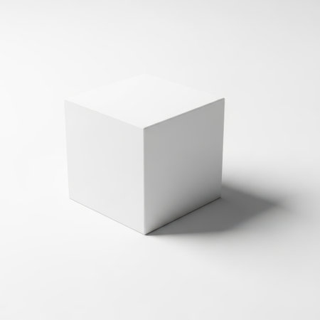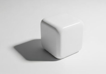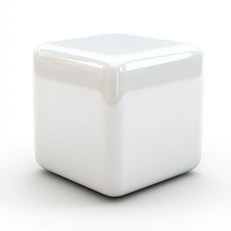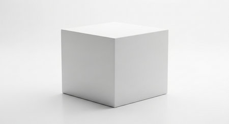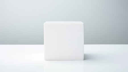 The image depicts a simple, pristine white cube placed on a flat, gray surface. The cube is positioned slightly off-center to the left, casting a subtle shadow beneath it. The background is a uniform gray, providing a stark contrast to the cube's bright white color. The lighting is soft and diffused, creating a gentle shadow that adds depth to the otherwise flat surface. The overall composition is minimalistic and geometric, emphasizing simplicity and clean lines.
