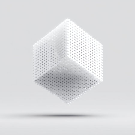 This image showcases an abstract floating cube with a perforated surface, casting a subtle shadow on a smooth gray background, ideal for modern design themes.