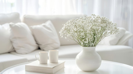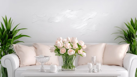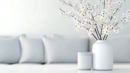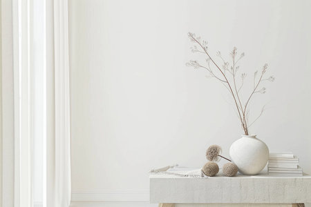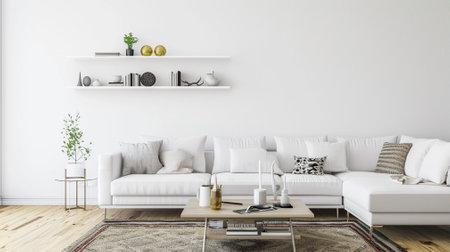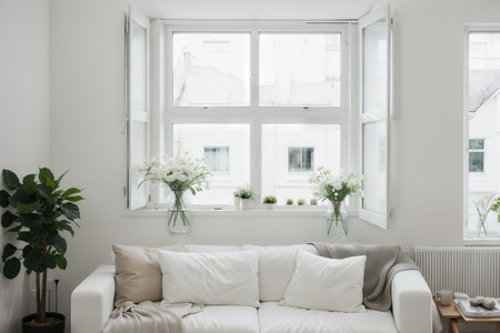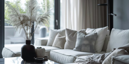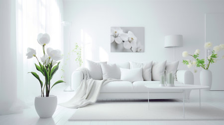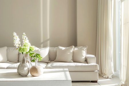 Sunlit elegance meets minimalism in this serene living space. Creamy cushions and soft natural light enhance the tranquility. Perfect for a relaxing retreat. Generated A.I.
