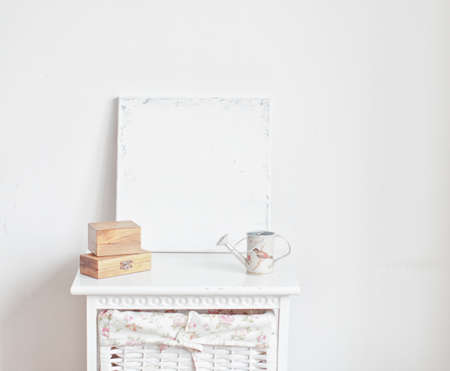 Home interior decoration with canvas, watering can and wooden boxes on the bedside table