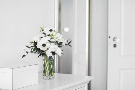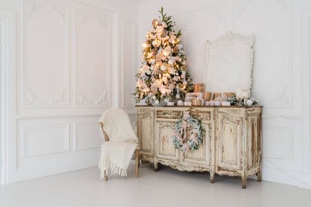 Christmas tree on wooden chest of drawers commode bureau in white interior, decorated with artificial flowers, garlands and toys.