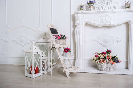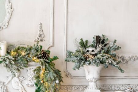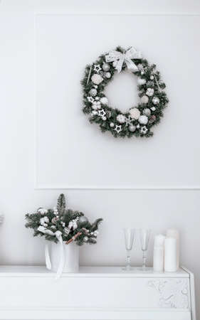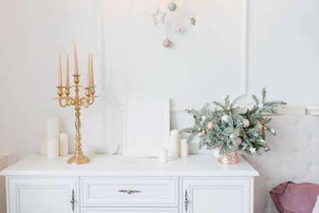 Christmas decor white chest of drawers in the bedroom or living room, candlestick, spruce arrangement and candles