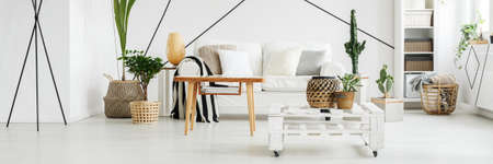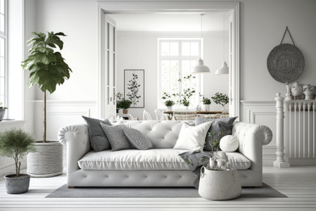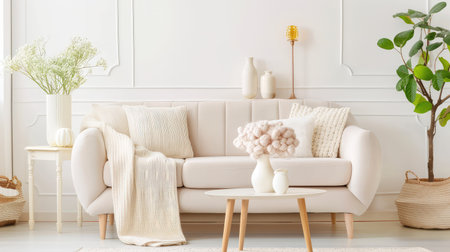 couch in a white living room. Scandinavian style in decorating. Generative AI
