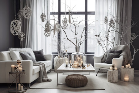 White toned living room interior with Halloween decorations. Background for Halloween.