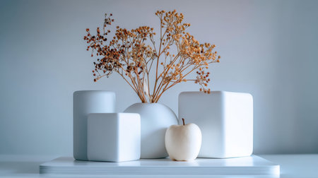 This minimalist composition showcases white geometric shapes, a decorative vase filled with dried flowers, and a single apple, creating a calm, elegant atmosphere.