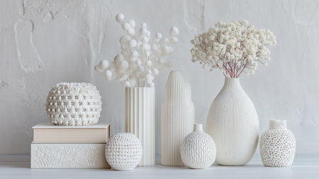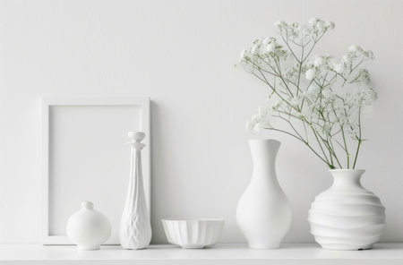 Modern vases. plants and home decor on a white shelf against a white wall. Banner with copy space.