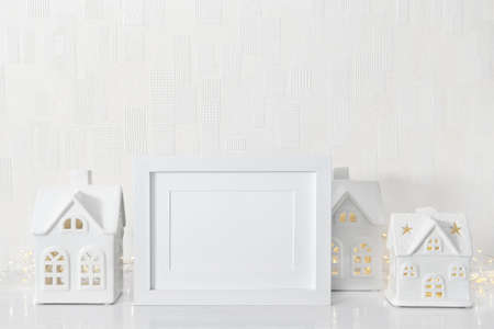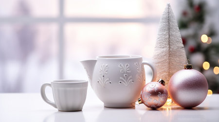Beautiful Christmas decorations on white table, closeup. Space for text