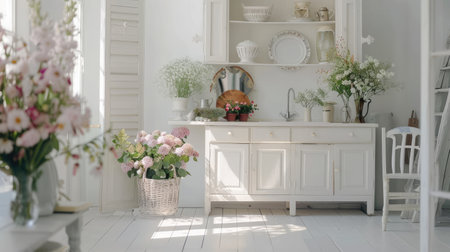 a kitchen with a vintage cabinet, white walls and floor, a basket of flowers on the table, and a mirror above the cabinets.