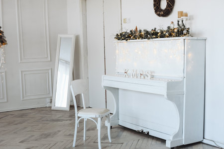 White piano is Decorated with Christmas Decor. Bright Interior of the House on New Year's Eve. White Parquet Floor. Cozy and Bright Home.