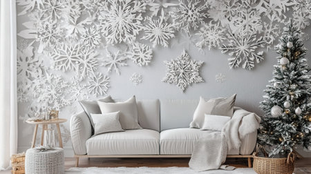 Cozy white living space with decorated Christmas tree, stylish gift wrapping, and snow-covered trees visible through frosty windows