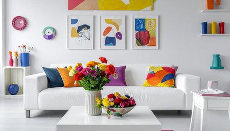 This modern living room features a stunning white sofa adorned with a variety of colorful cushions, complemented by vibrant wall art and stylish decor elements.